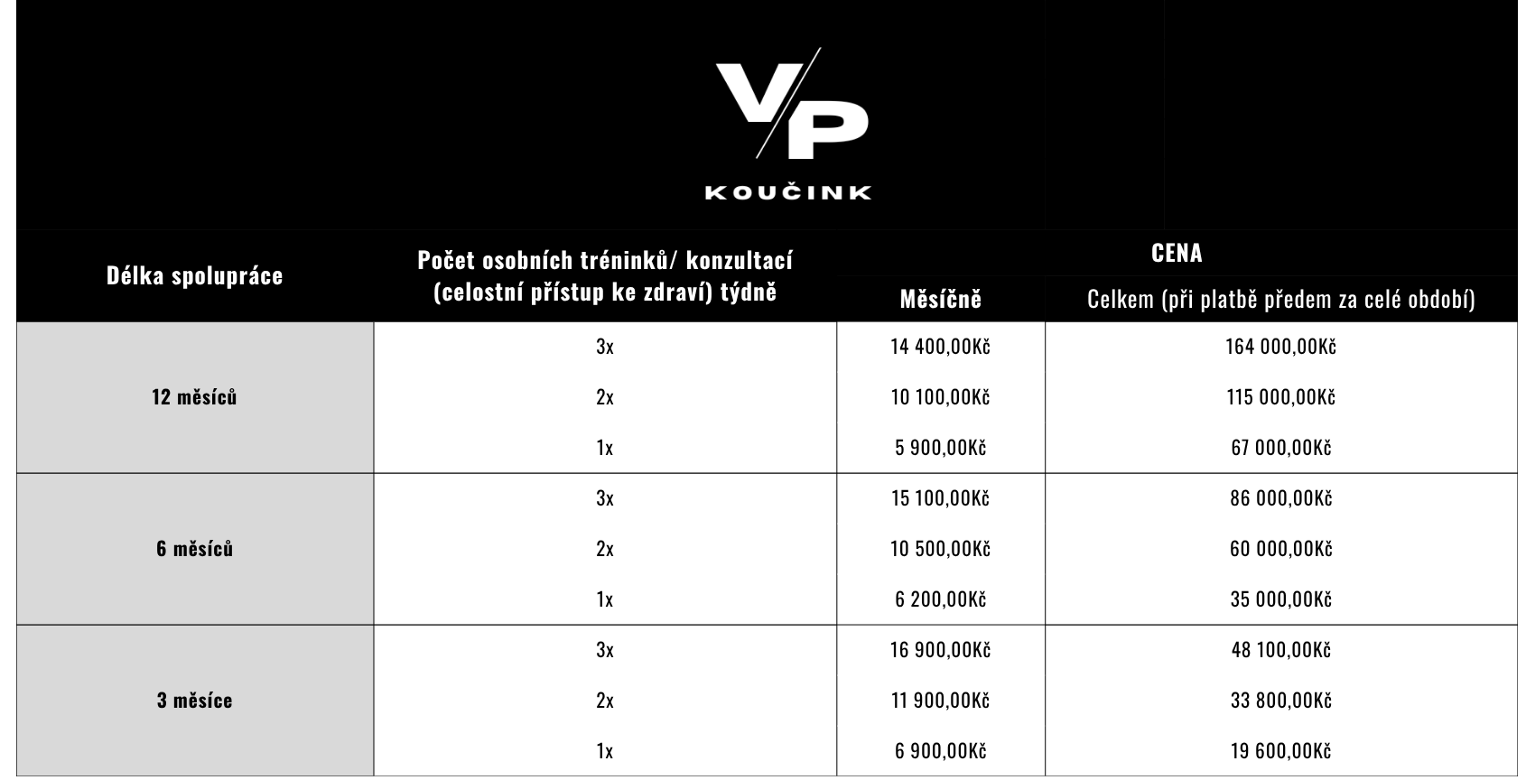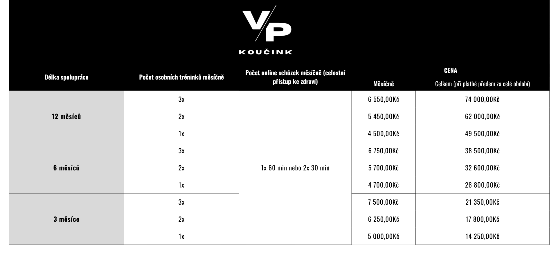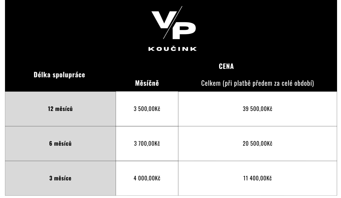 V případě 12 měsíční spolupráce je od celkové ceny odečteno 5 týdnů mé nebo tvé dovolené.